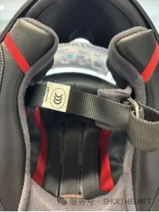 【适用产品】仅限获得中国强制性产品认证(3C认证)标志的产品。 3C 认证标识缝制在头盔右侧**下巴带**处,具体确认方法请参照下图。