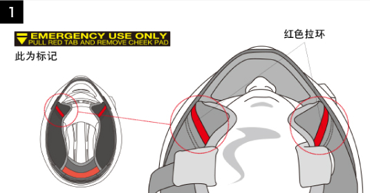 万一发生意外事故,实施救援作业时由第三者摘除骑手头盔的作业远比想象中更困难。头盔不仅要具备吸收冲击力的性能及舒适性,支持紧急情况下救援作业的功能也是其重要功能之一。SHOEI开发的E.Q.R.S.(Emergency Quick Release System)只需拉动专用丝带的简单操作,便可将可能受伤的颈部所受的负担降低到尽可能小的程度,同时还可轻松摘除头盔。
